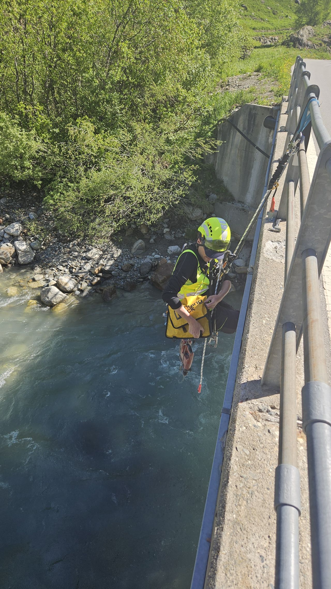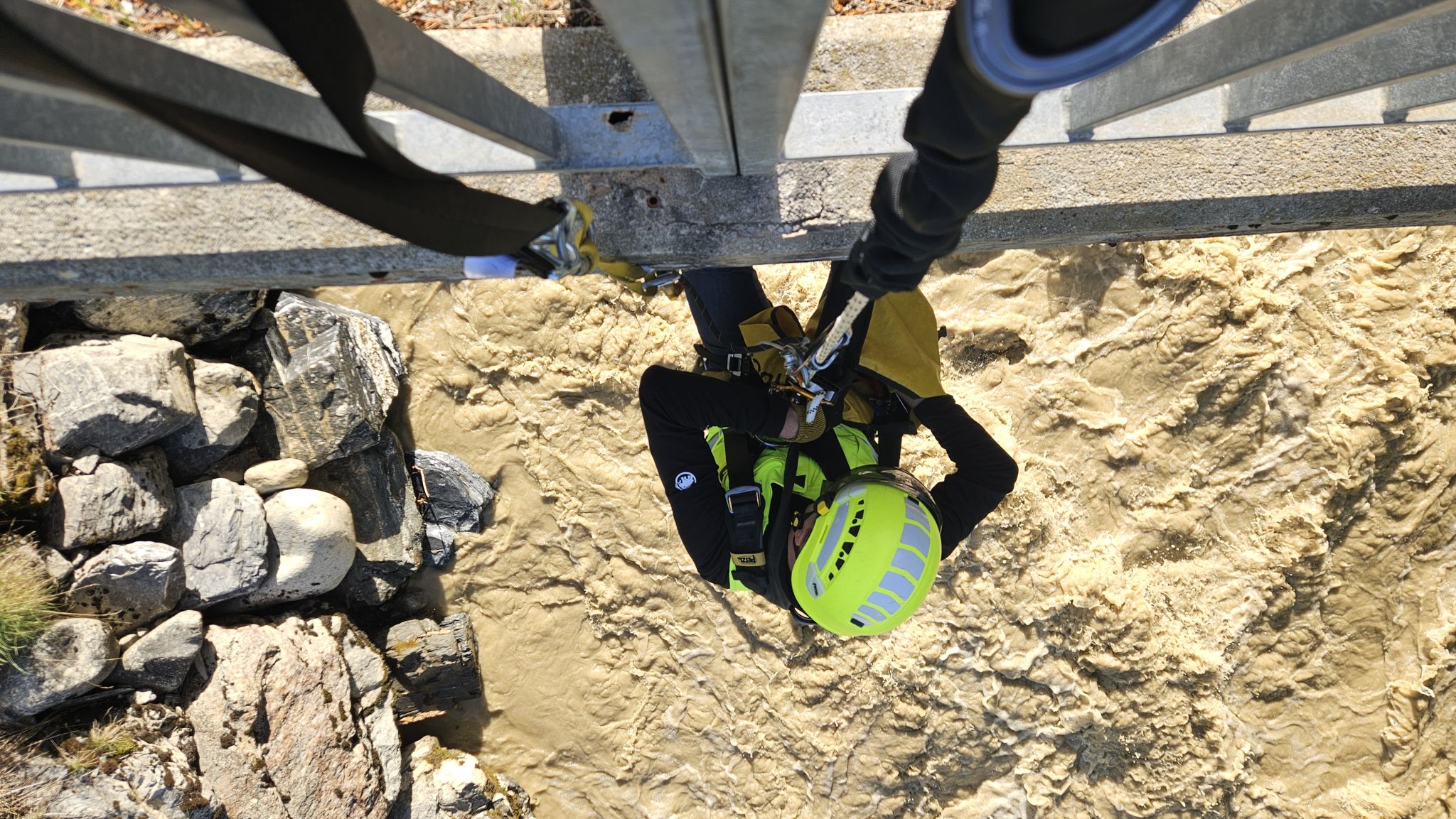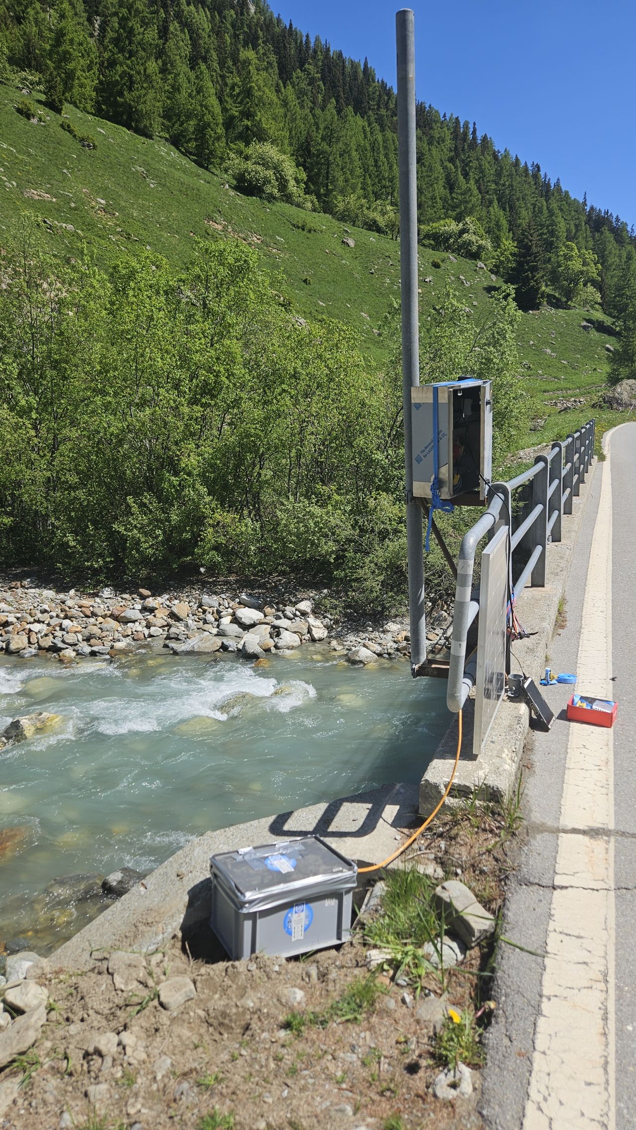 Le week-end passé, deux jours après l’éboulement, nos experts du CREALP ont été mobilisés pour installer deux stations hydrométriques provisoires, l’une en amont et l’autre en aval du glissement. Ces stations permettront de surveiller en continu l’évolution de la situation hydrologique et d’appuyer les autorités dans la gestion du risque. Merci à l’appuis de Ludwig Haas du SDANA – Service des dangers naturels Valais qui a rendu cette installation possible !